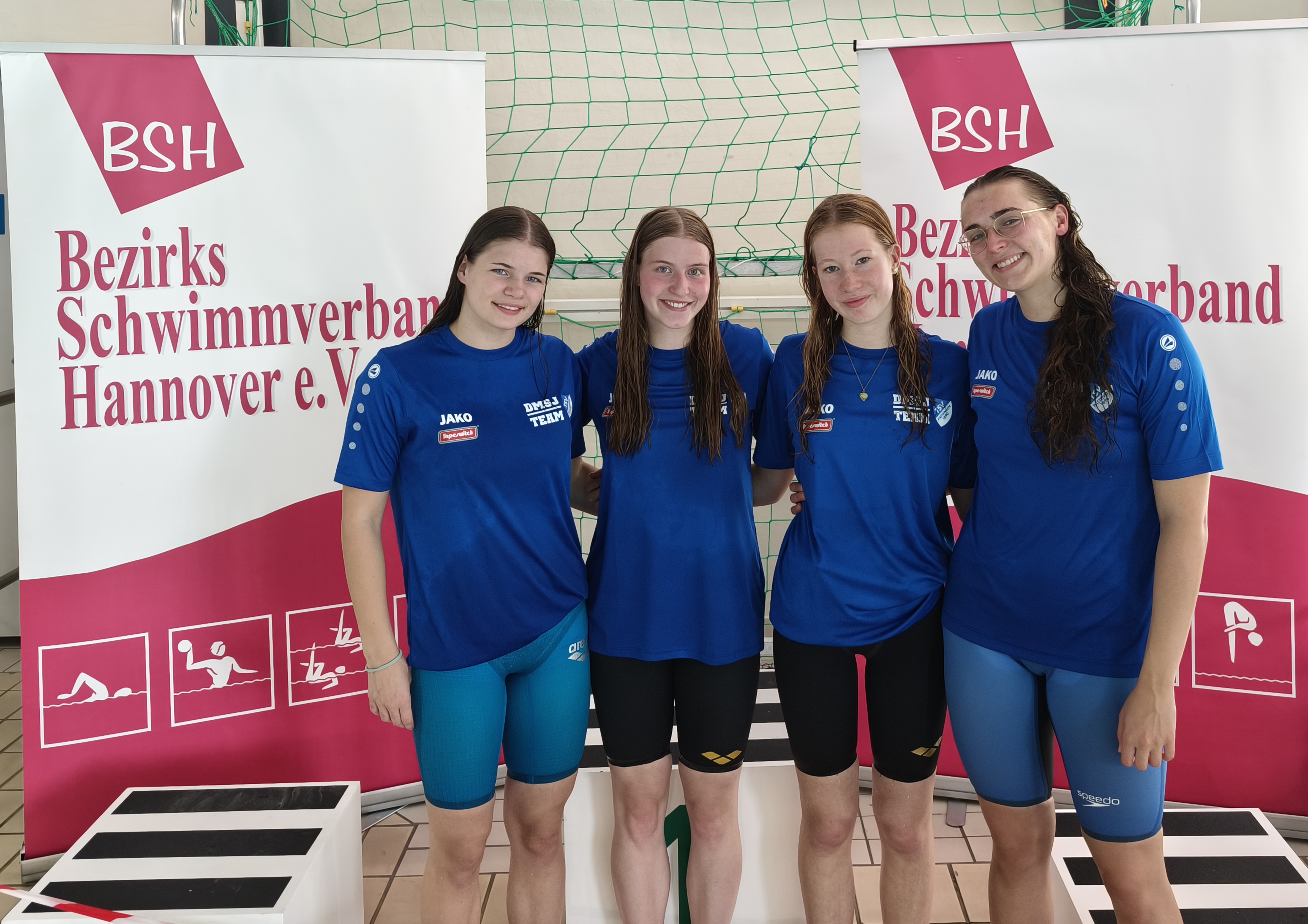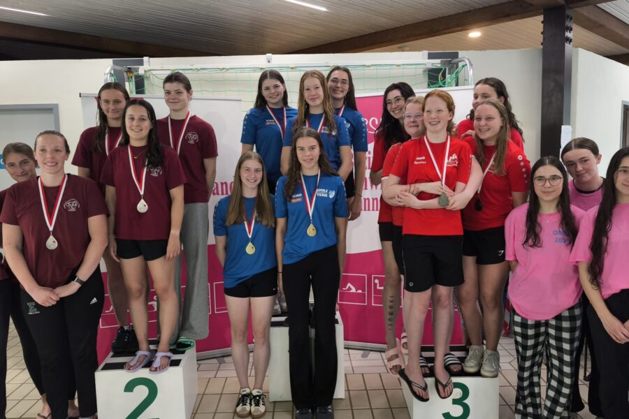 Die weibliche Staffel des TSV Pattensen in der offenen Wertung, die ja ohne Alterseinschränkungen, aber auch außer Konkurrenz für die Qualifikation zum DMSJ-Bundesentscheid startet, hatte die nicht minder schwere Aufgabe, den im letzten Jahr gewonnenen Titel auf Bezirksebene auch jetzt in 2025 zu verteidigen. Die Besetzung der Mannschaft sah in diesem Jahr, aufgrund einiger zur Zeit stattfindenden Auslandsaufenthalte und kürzlicher Vereinswechsel von Schwimmerinnen zu anderen Vereinen etwas anders aus. Es starteten mit Katja Breithaupt (Jg.´01), Joyce Metzger, Leonie Zank, Linda Sievers (alle Jg.´08), sowie Annike Ahrens (Jg.´09) aber trotzdem 5 bereits sehr erfahrene Wettkampfschwimmerinnen, die mit Motivation, Ehrgeiz und Leistungsstärke im Wasser das „Unternehmen Titelverteidigung“ in Angriff nahmen. Und das gelang tatsächlich in eindrucksvoller Manier. Nur in der als 2. stattfindenden 4 x 100m Brust-Staffel belegten die TSV-Damen einen immer noch passablen 3. Rang, ansonsten wurden alle weiteren Staffeln, insbesondere die Rücken-Staffel, sehr überzeugend gewonnen. Letztendlich stand eine Gesamtzeit von 24:26,61 min. zu Buche und alle TSV-Schwimmerinnen des Teams nahmen freudig bei der abschließenden Siegerehrung die verdiente Goldmedaille in Empfang.